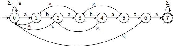 We can compute and store these failure arcs using an array , where the failure arc from state leads to . The indices differ by because we don't need to store the failure arc for state , as it has a loop if the character for valid transition doesn't match. Thus, stores the destination of failure arc originated from state 1 (which is always 0) and stores the destination of failure arc orginated from state .